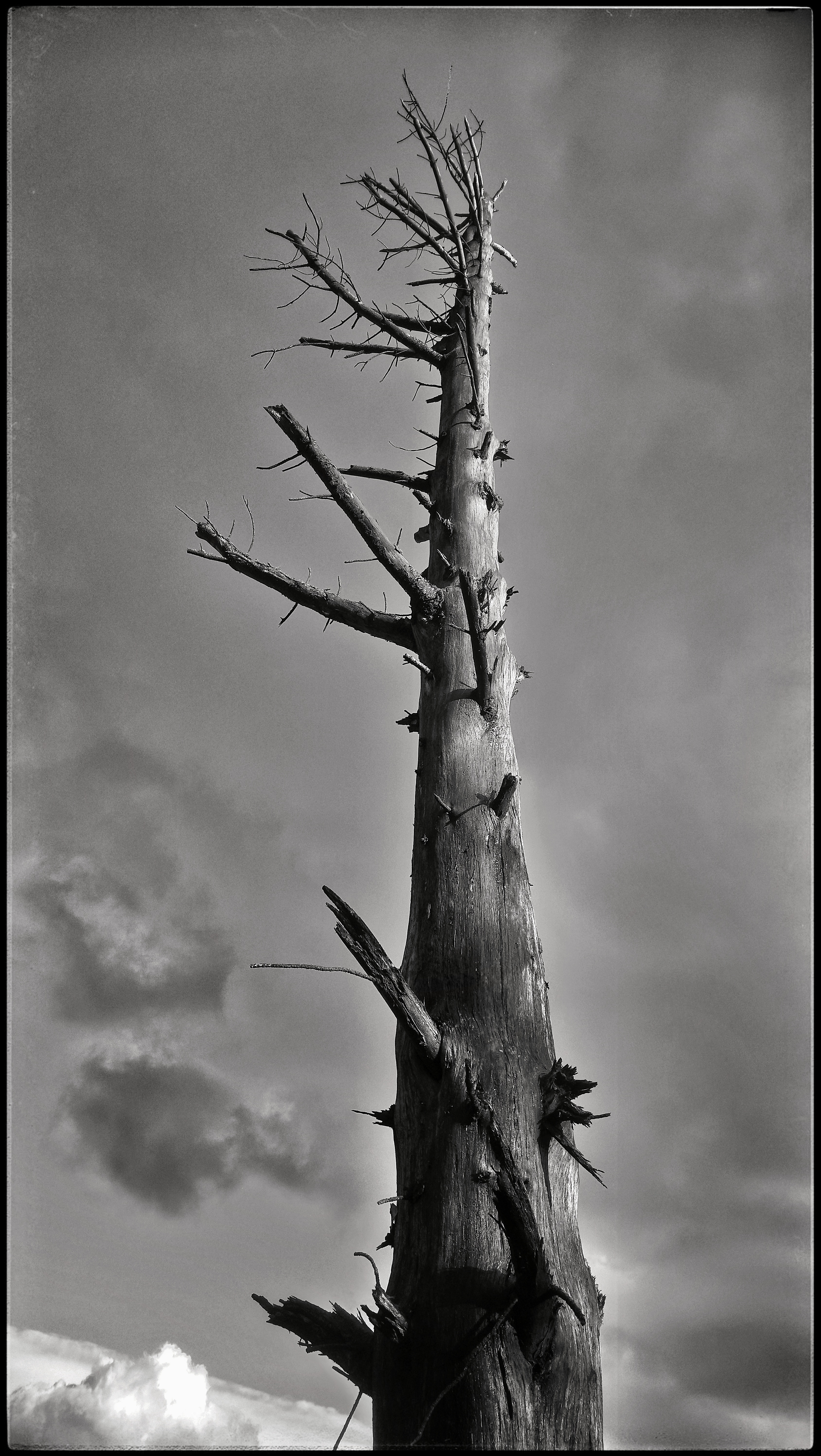 This weeks image comes from an evening walk in Drumkeeragh forest. Heavy rain clouds filled the sky, but has I approached this dead tree the sun broke through and brought out the texture of the tree. Moving in close I shot this on my mobile /cell phone. Edited in Snapseed and posted here.